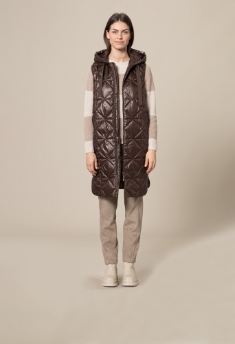 На сайте указаны российские размеры. Длинный стеганый жилет со слегка блестящим эффектом. Полиэстер высокого качества. Боковые карманы, капюшон с кулиской, двусторонняя молния. Прямой крой и посадка, без талии. Длина жилета - 97 см.