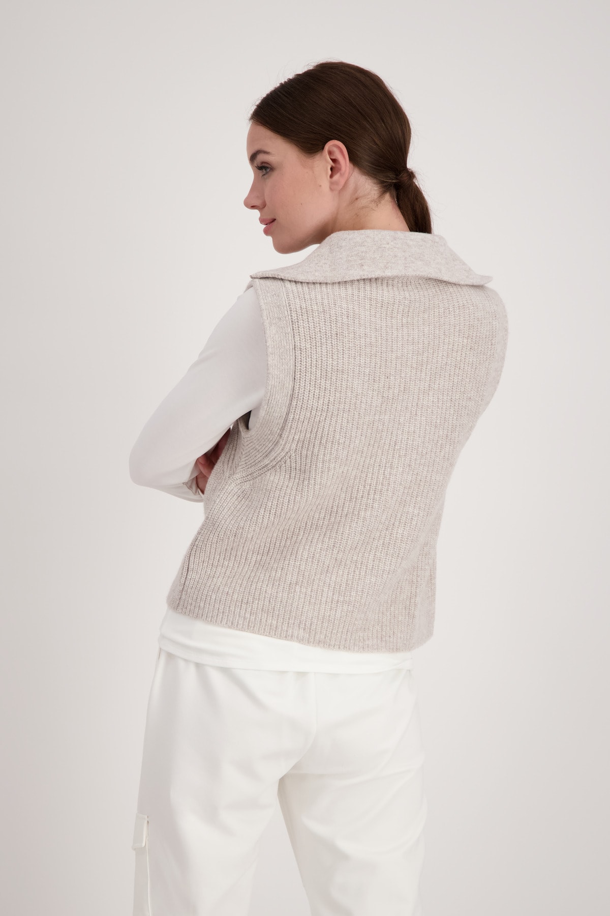 На сайте указаны российские размеры. Трикотажный жилет с застежкой-молнией и тройным воротником. Безрукавка имеет широкик манжеты на несуществующих концах рукавов. Трикотажный комбинезон из мягкой шерсти гарантирует непревзойденный комфорт. Незаменимая вещь в каждом гардеробе! Модель ростом 179 см. Длина спины 44 размера составляет 62 см.