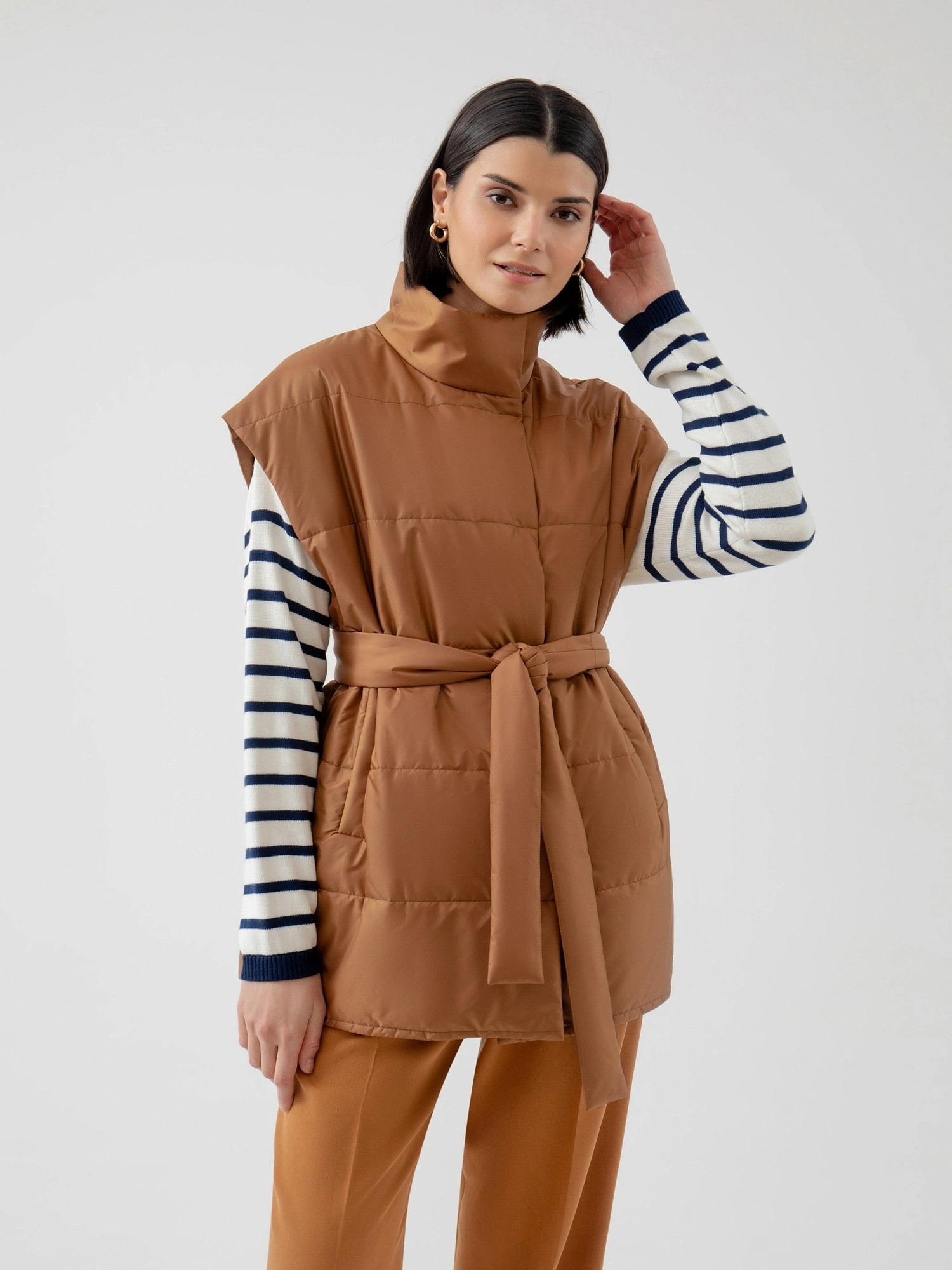 На сайте указаны российские размеры. Стеганый жилет в роскошном медовом цвете из плотной и мягкой плащевой ткани. Жилет выполнен на утеплителе, что сделает Ваш образ не только стильным, но и очень теплым. Воротник-стойка имеет комфортную посадку, которая не стеснит движений и при этом будет надежно защищать от ветра. В качестве дополнительного декоративного элемента в комплекте идет пояс, который сделает силуэт более женственным и утонченным. Для дополнительной защиты от ветра жилет выполнен с использованием мембраны RaftPro. Длина изделия 73 см. Рост модели 175 см.