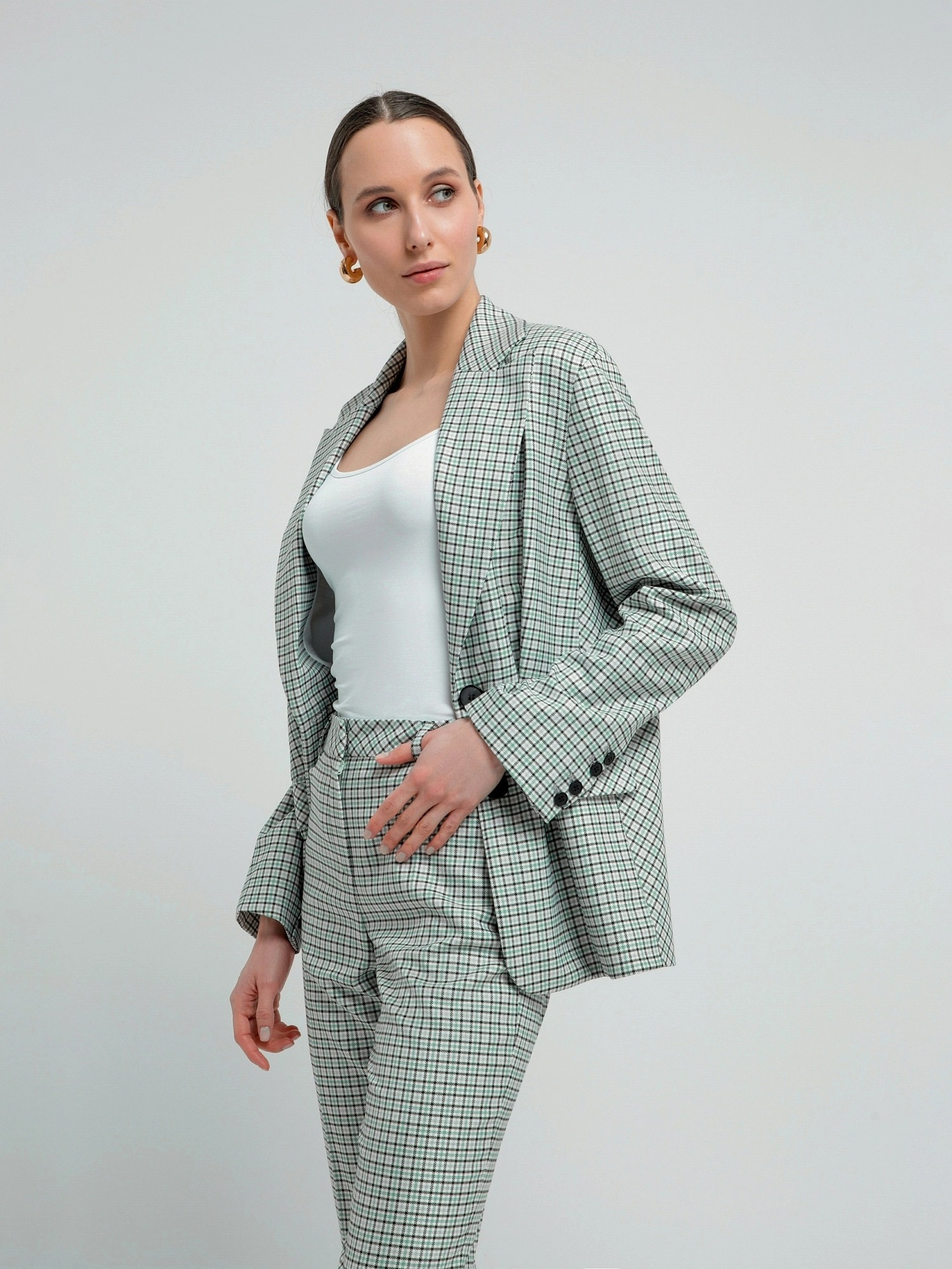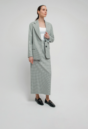 На сайте указаны российские размеры. Однобортный жакет на подкладке со спущенной линией плеча и округлыми лацканами. Жакет выполнен из костюмной ткани в мелкую клетку серо-бирюзового цвета. Рост модели 175 см.