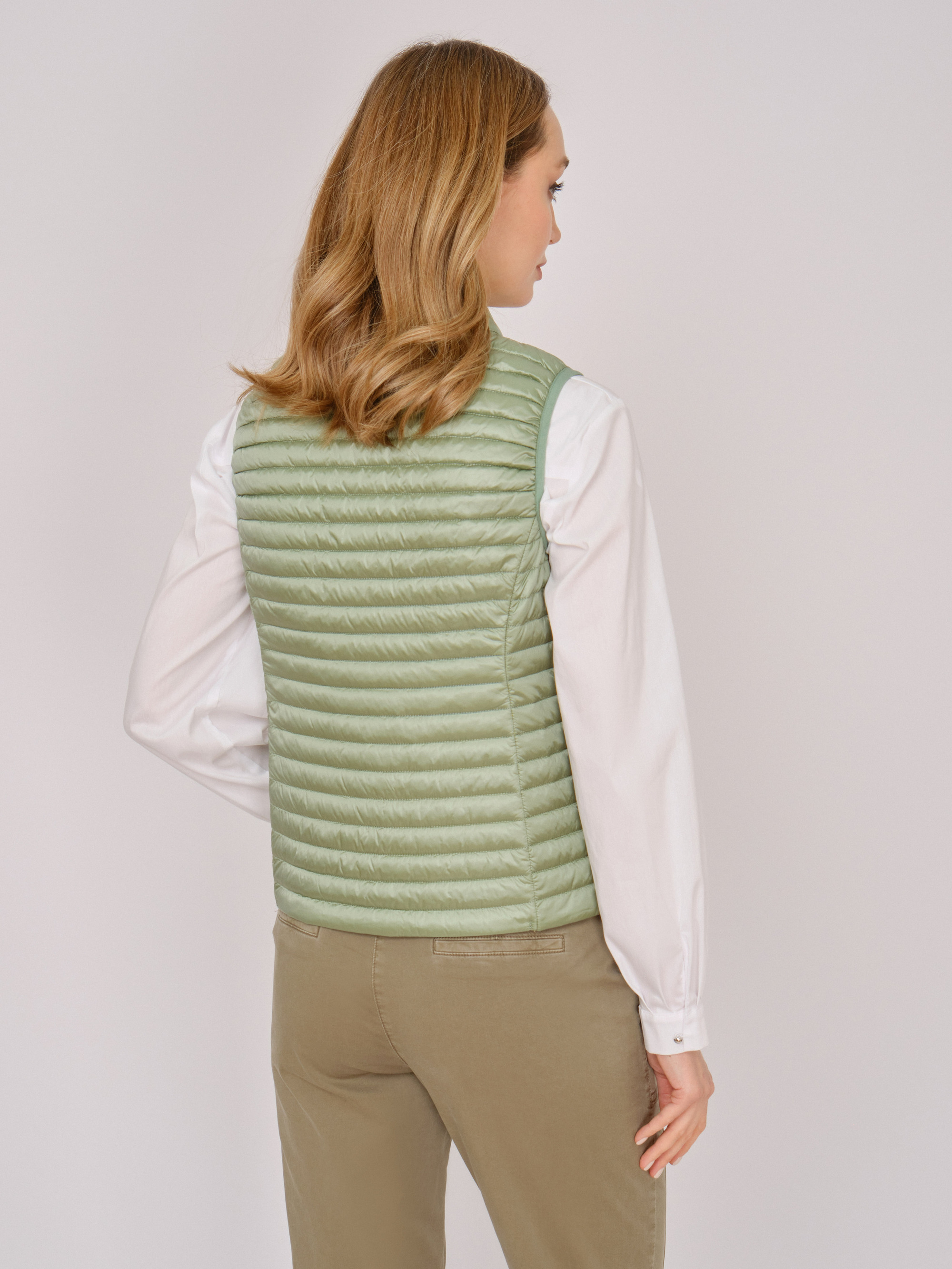 На сайте указаны российские размеры. Полуприталенный стеганный мятный-зеленый жилет на молнии, с карманами в шве на молнии. Длина по спинке: 54 см. Рост модели: 175 см.