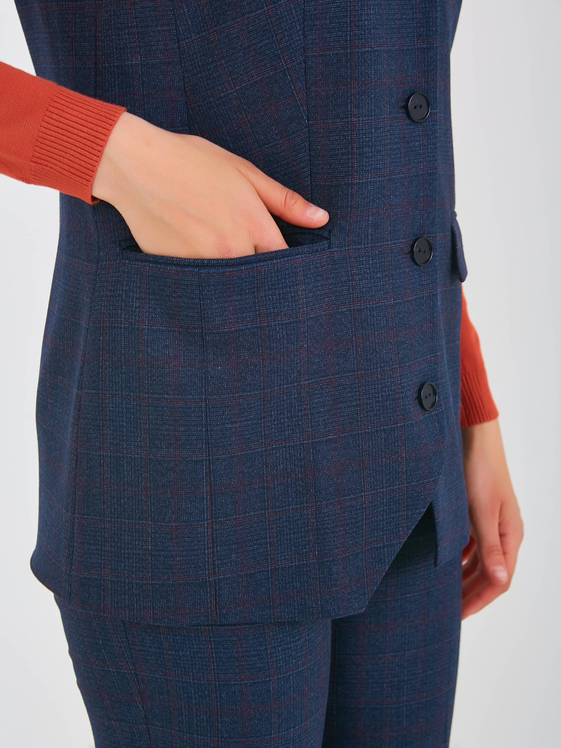 Жилет удлиненный прямого силуэта, с застежкой на четыре прорезные петли и пуговицы, дизайнерская особенность модели - принт в "клетку". Перед с вытачками для лучшей посадки по фигуре, также имеются прорезные карманы с клапанами. По спинке также имеются вытачки. Воротник пиджачного типа.