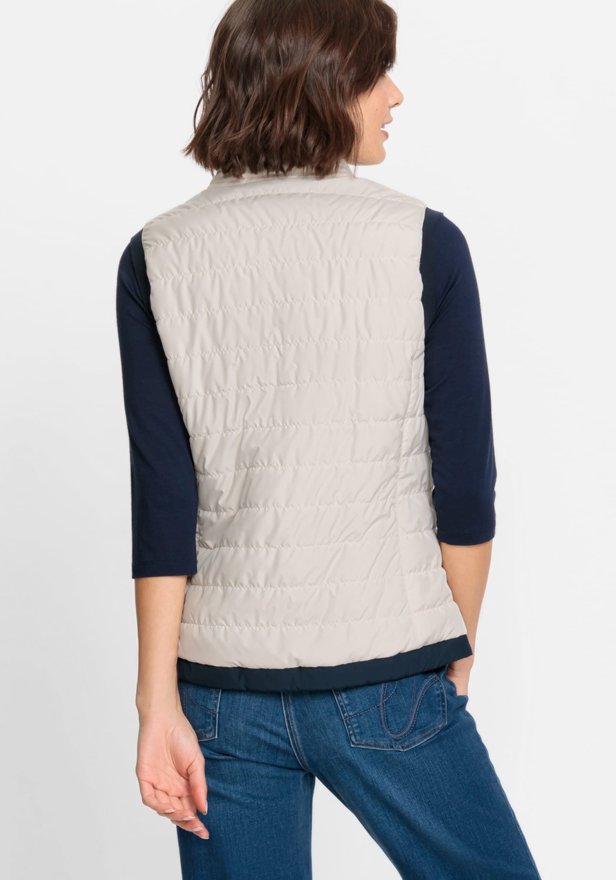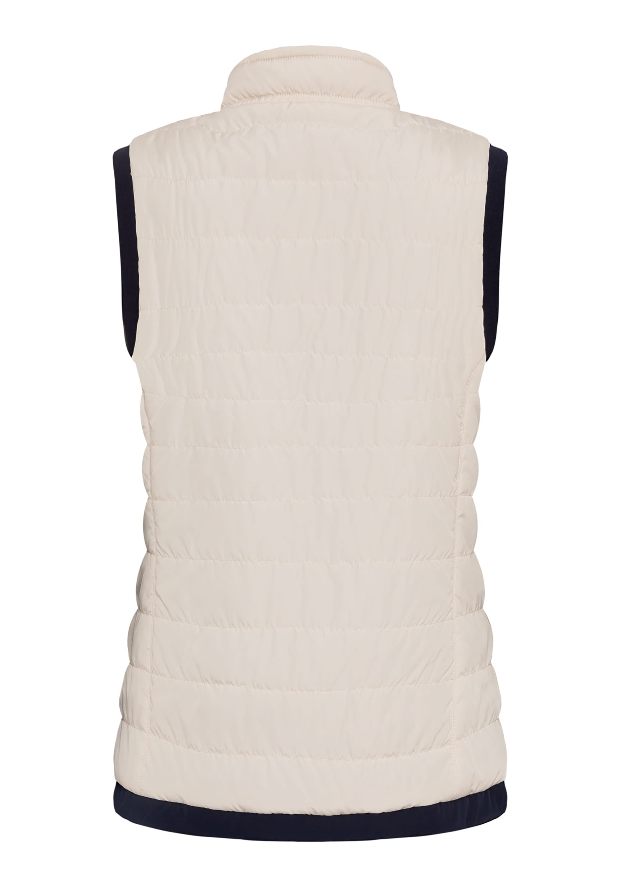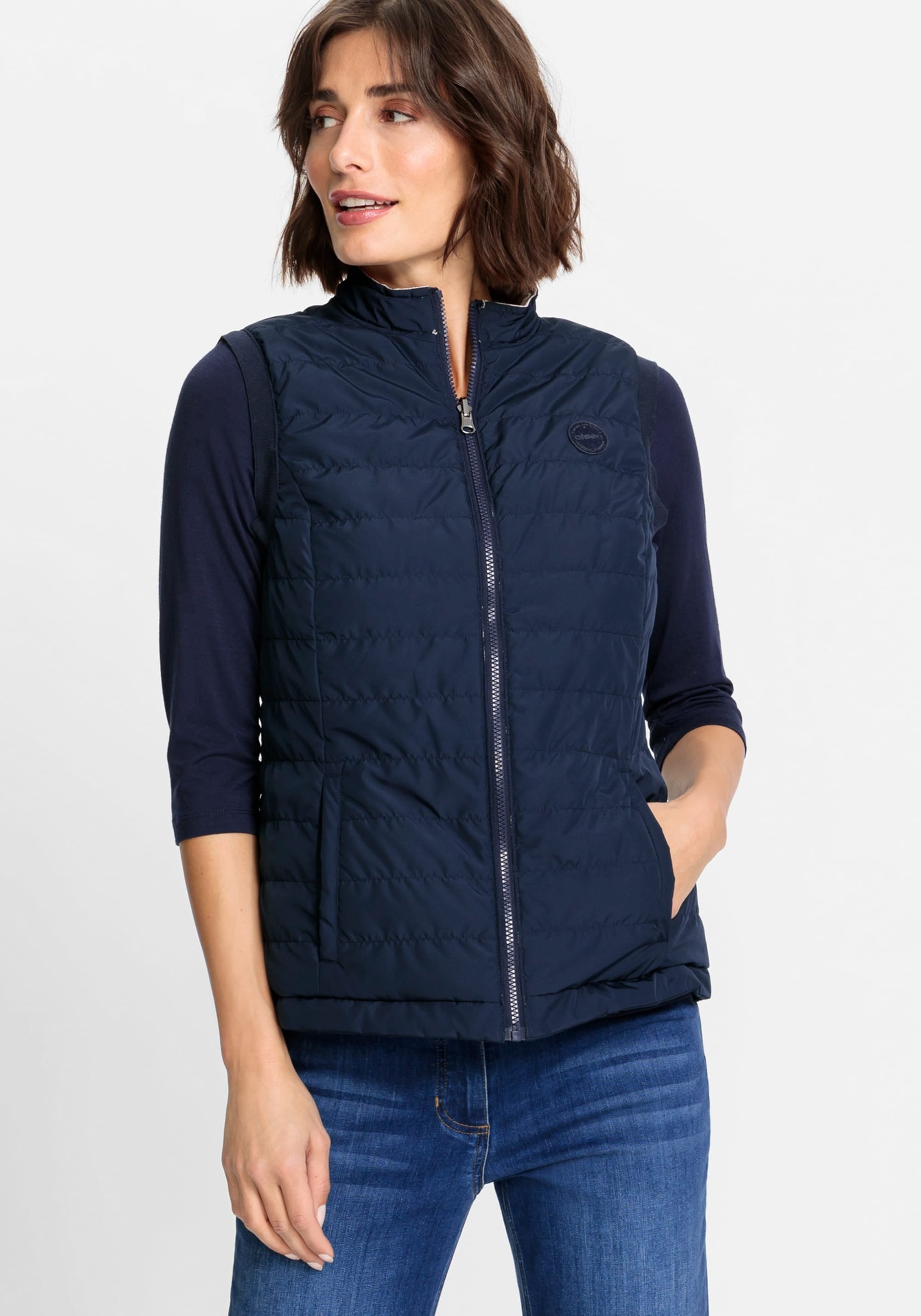 Жилет двусторонний, и его можно носить двумя способами в зависимости от вашего настроения и образа. Стильные особенности включают фирменную нашивку Olsen на груди, двойную застежку-молнию, два передних кармана на молнии и функциональные завязки на высоком воротнике. Кремовый — можно носить перевернутым, как чернильно-синий.