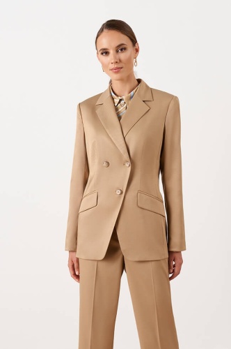 Стильный двубортный жакет прямого силуэта. Отложной воротник с лацканами. Застежка на три роговые пуговицы. Рукава заканчиваются шлицей с имитацией застежки на роговые пуговицы. Спереди имитация карманов с клапанами. Средний шов спинки заканчивается шлицей. Подкладка с дизайнерским принтом «Гортензия».