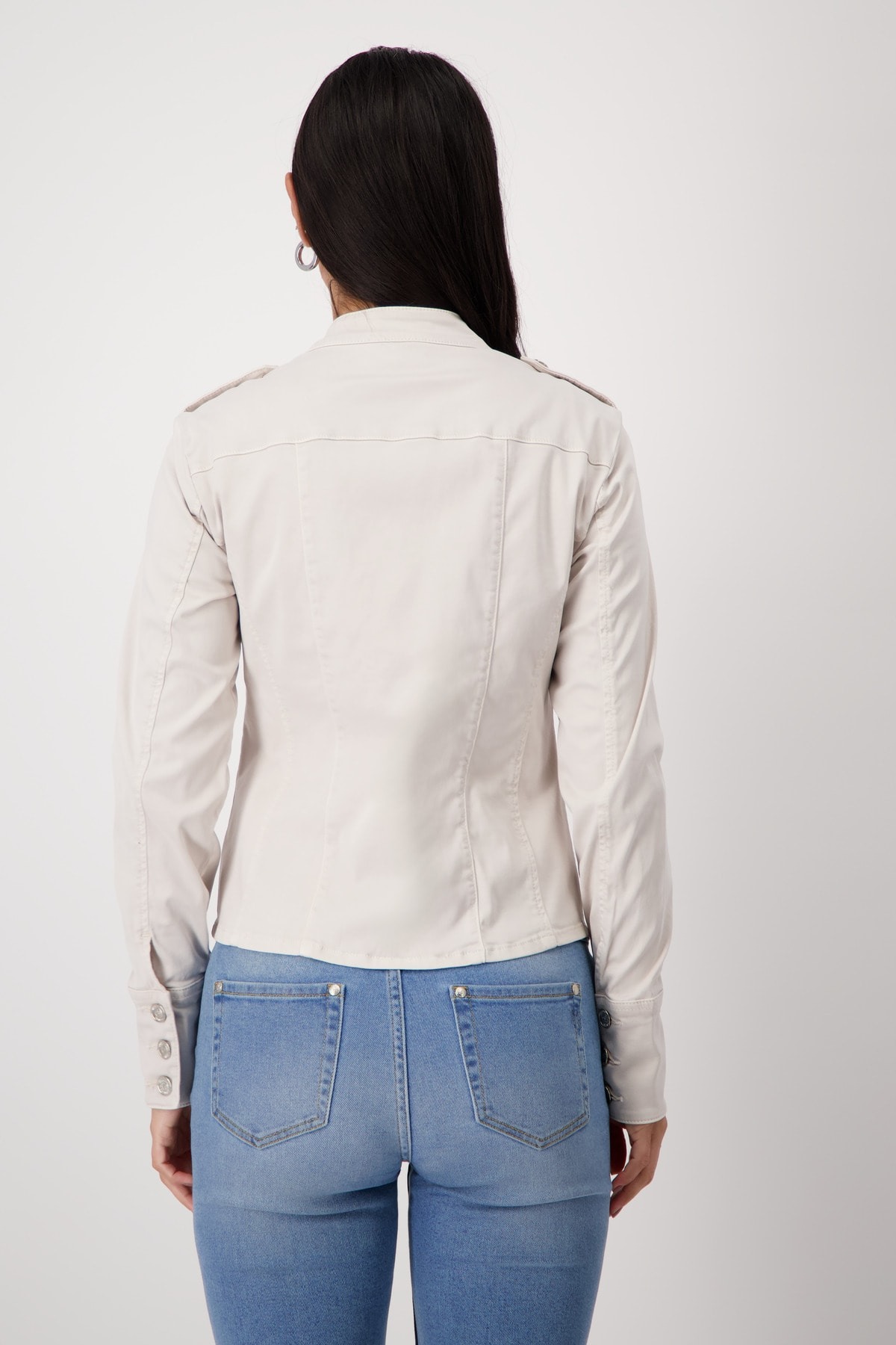 Стильная куртка из мягкого смесового лиоцелла с карманами с клапанами и бретелями, украшенная декоративной пуговицей. Эластичный материал. Регулярная посадка. Воротник-стойка и бретели с декоративными пуговицами. Длинные рукава с манжетами. Накладные карманы с клапанами на уровне груди. Удлиненная, закругленная передняя часть. Длина 44-го размера по спинке — 57 см, длина по переду — 59 см.