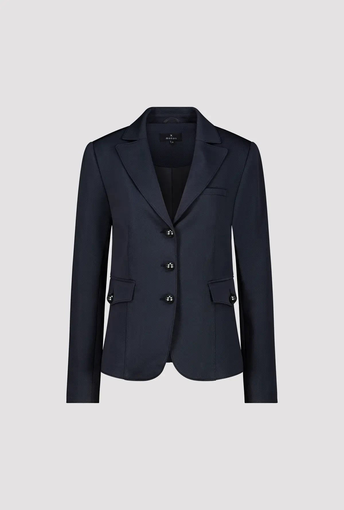 Жакет из эластичного материала с ребристой структурой, слегка приталенный. Воротник с лацканами. Ложный нагрудный карман и ложные карманы с клапанами. По центру планка с декоративными пуговицами.