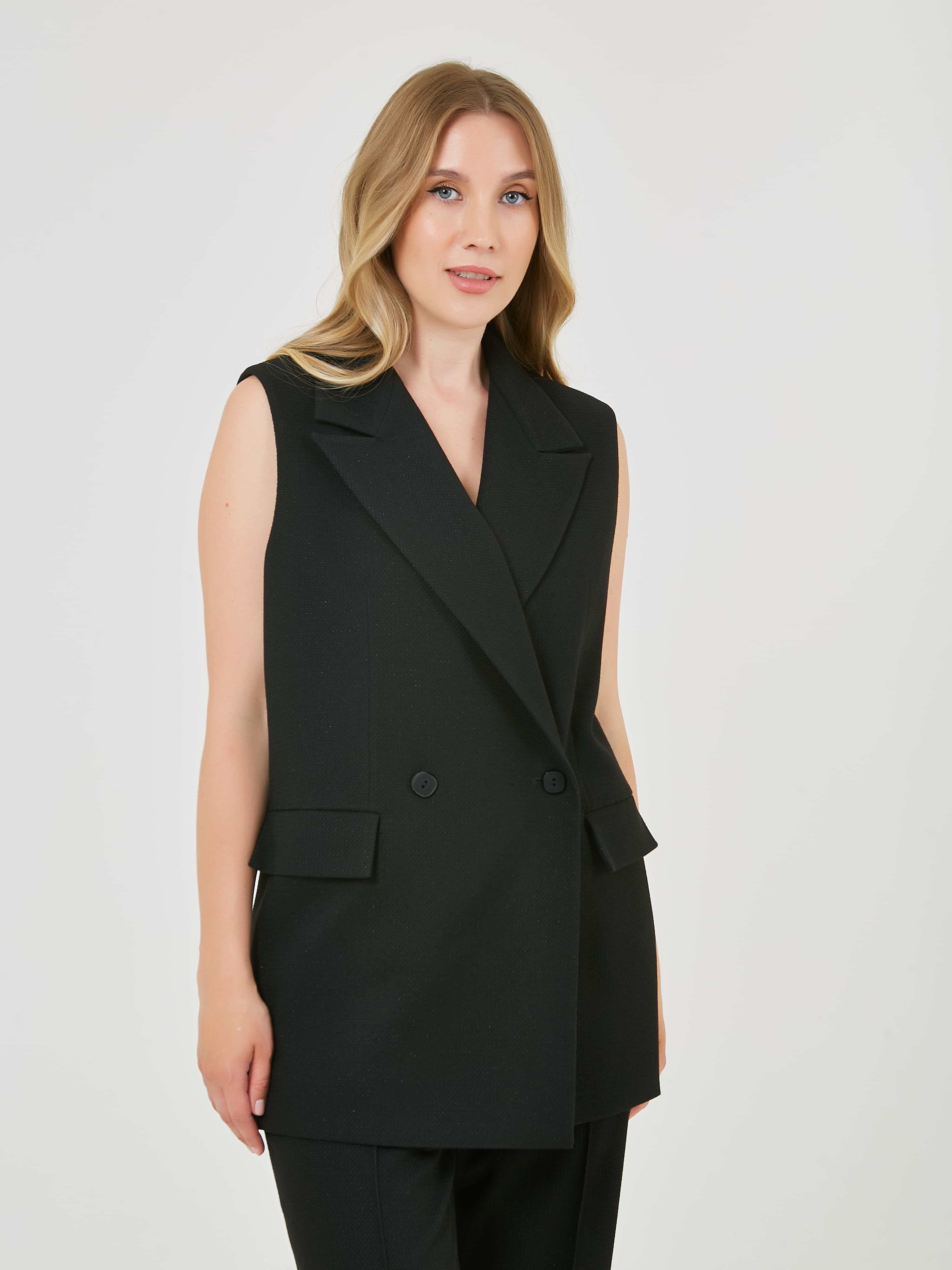 Чёрный приталенный жилет из плотного материала. Застёгивается на 1 пуговицу. На передней части расположены два клапана. Осень-Зима'25/26. Капсула "Малахитовая шкатулка"
