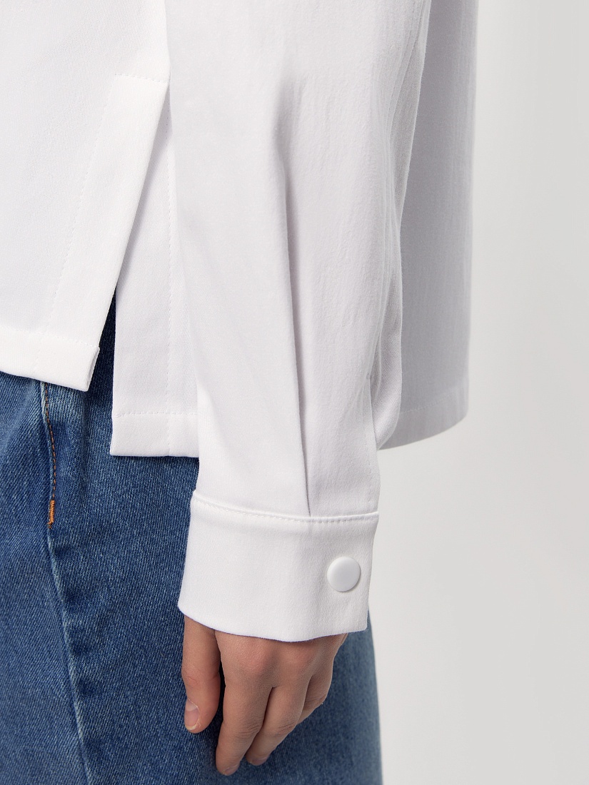 Жакет прямого силуэта с классическим отложным воротником, спущенным плечом и рукавом полной длины на манжете. Застежка спереди на кнопки в цвет ткани. Спереди рельефы и накладные карманы. Идеальный вариант для прохладной погоды. А белый цвет идеально сочетается с большим количеством повседневной одежды разных стилей.